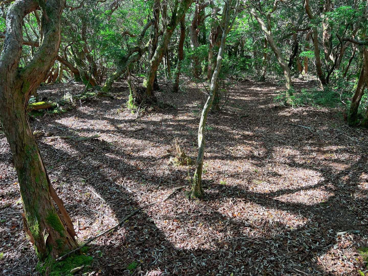 シャクナゲの群生地を通過。花の時期(5月〜6月頃)ではないけど、トンネルのように枝が覆いかぶさる独特の雰囲気は健在。