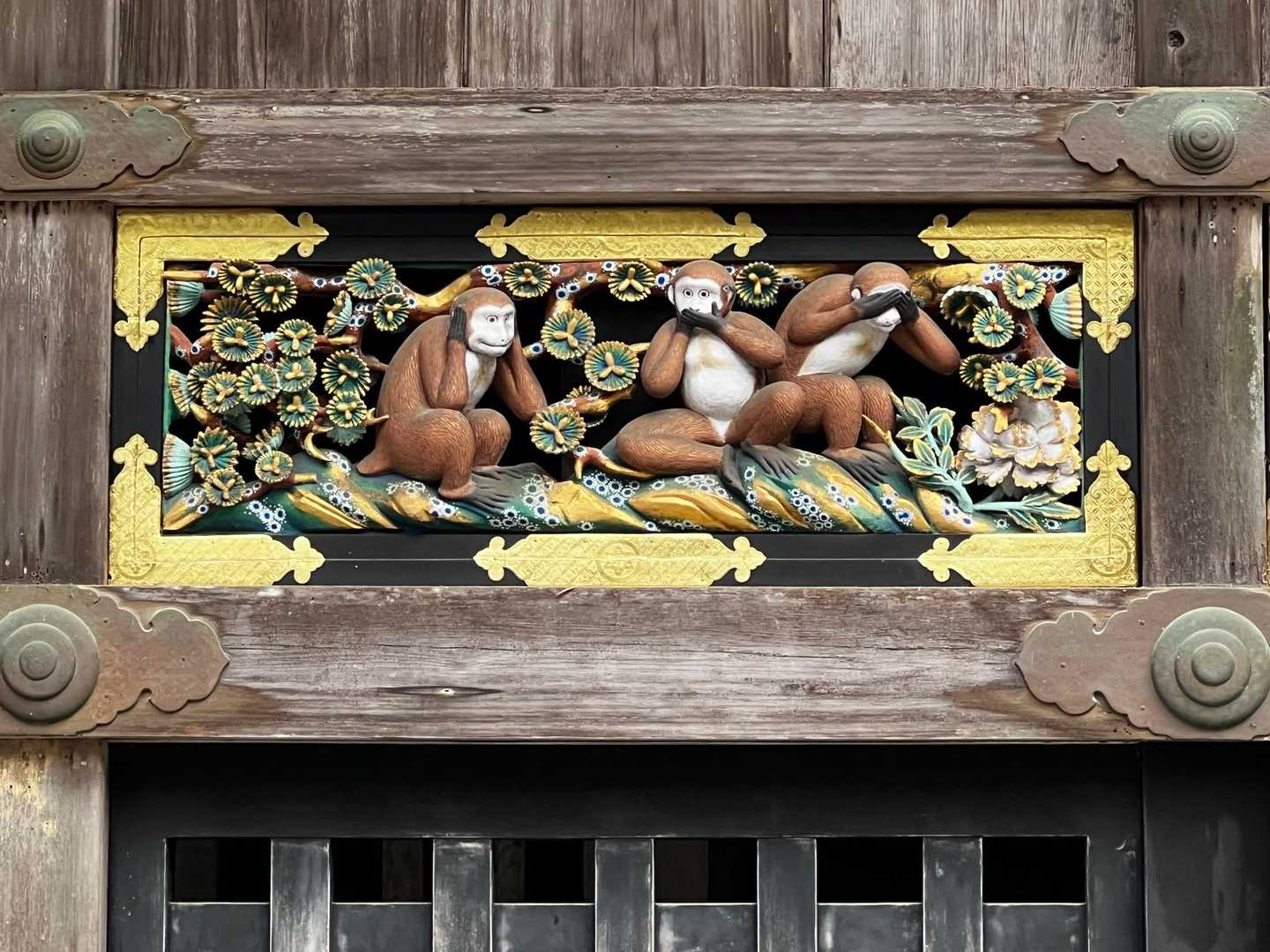 有名な三猿(見ざる聞かざる言わざる)の彫刻もしっかり鑑賞。何度見ても精巧な作りに感心する。